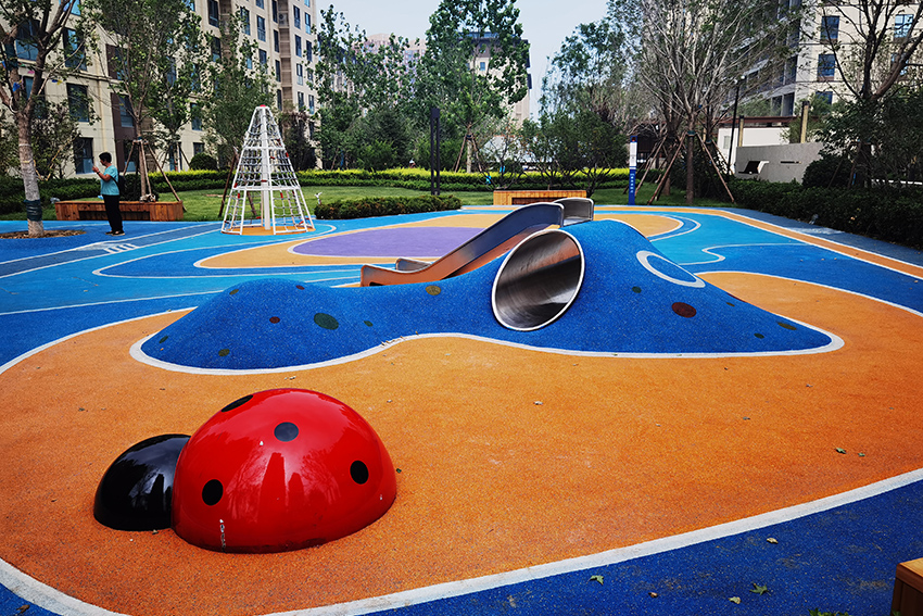 北京亦莊首創(chuàng)遠洋禧瑞天著社區(qū)的主題樂園位于社區(qū)內(nèi)的中心廣場,廣場采用橡膠地面,擁有微地形樂園,可以讓孩子鉆爬,也有滑滑梯,還有動物造型的小滑梯,秋千架,攀爬架等,可以讓孩子們自有玩耍。